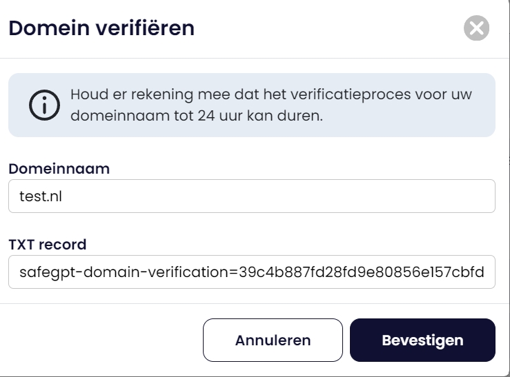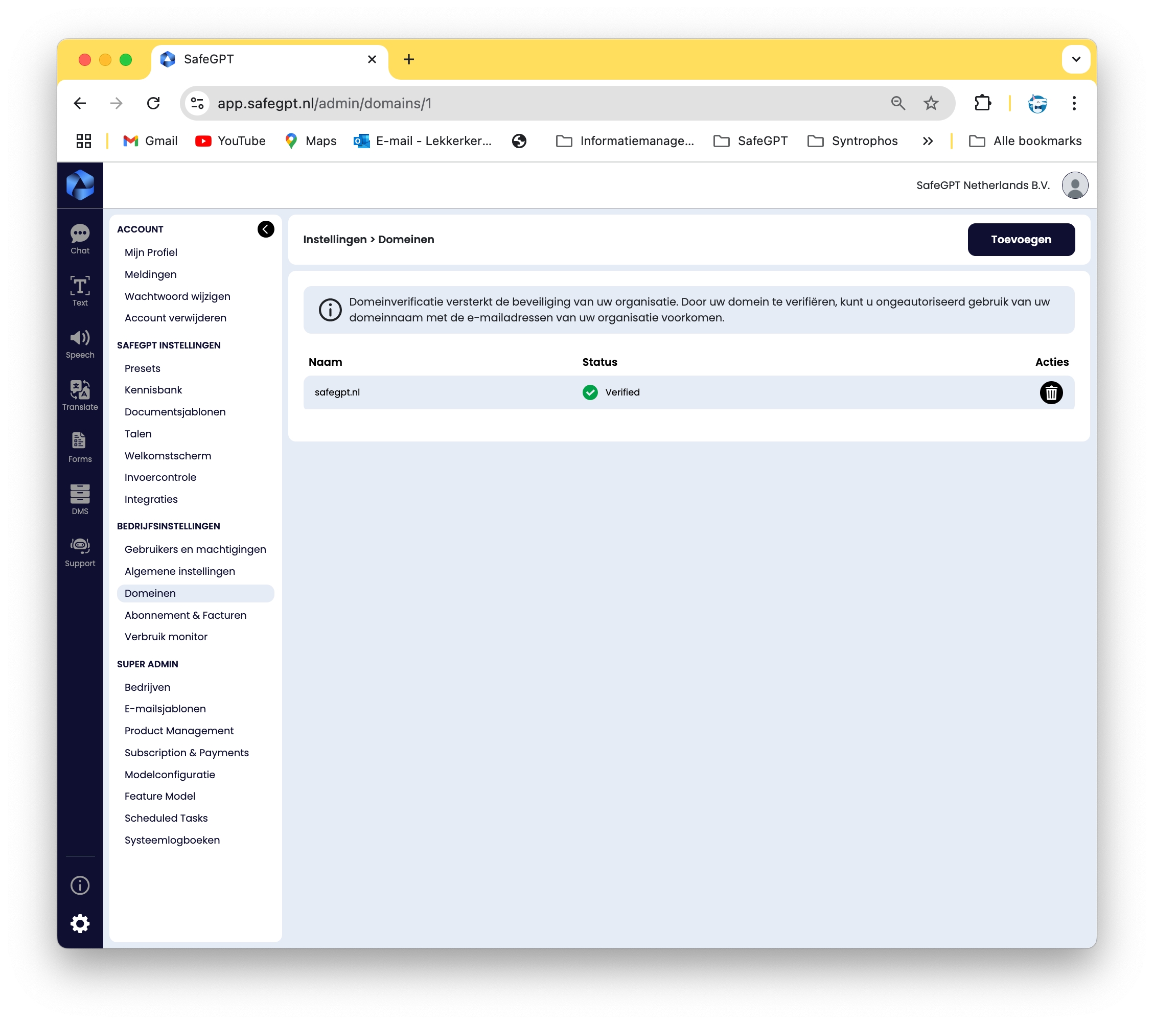 Add a company domain name to prevent unauthorized use of your environment. When your company name is authorized, employees from the organization will not be able to request their own trial account with safeGPT. This way, you ensure that accounts are issued centrally by the IT management organization.