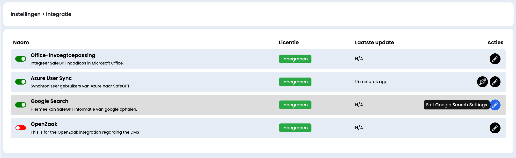 Activate the search function with Google and retrieve the results from Google search. As an organization, you can decide how many Google search results the chat assistant will use. (go to the integrations