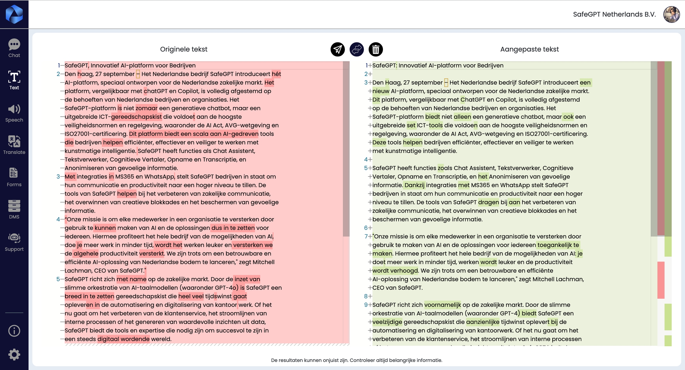 Click on the comparison symbol, and you can see which changes and improvements have been made to the text by SafeGPT.