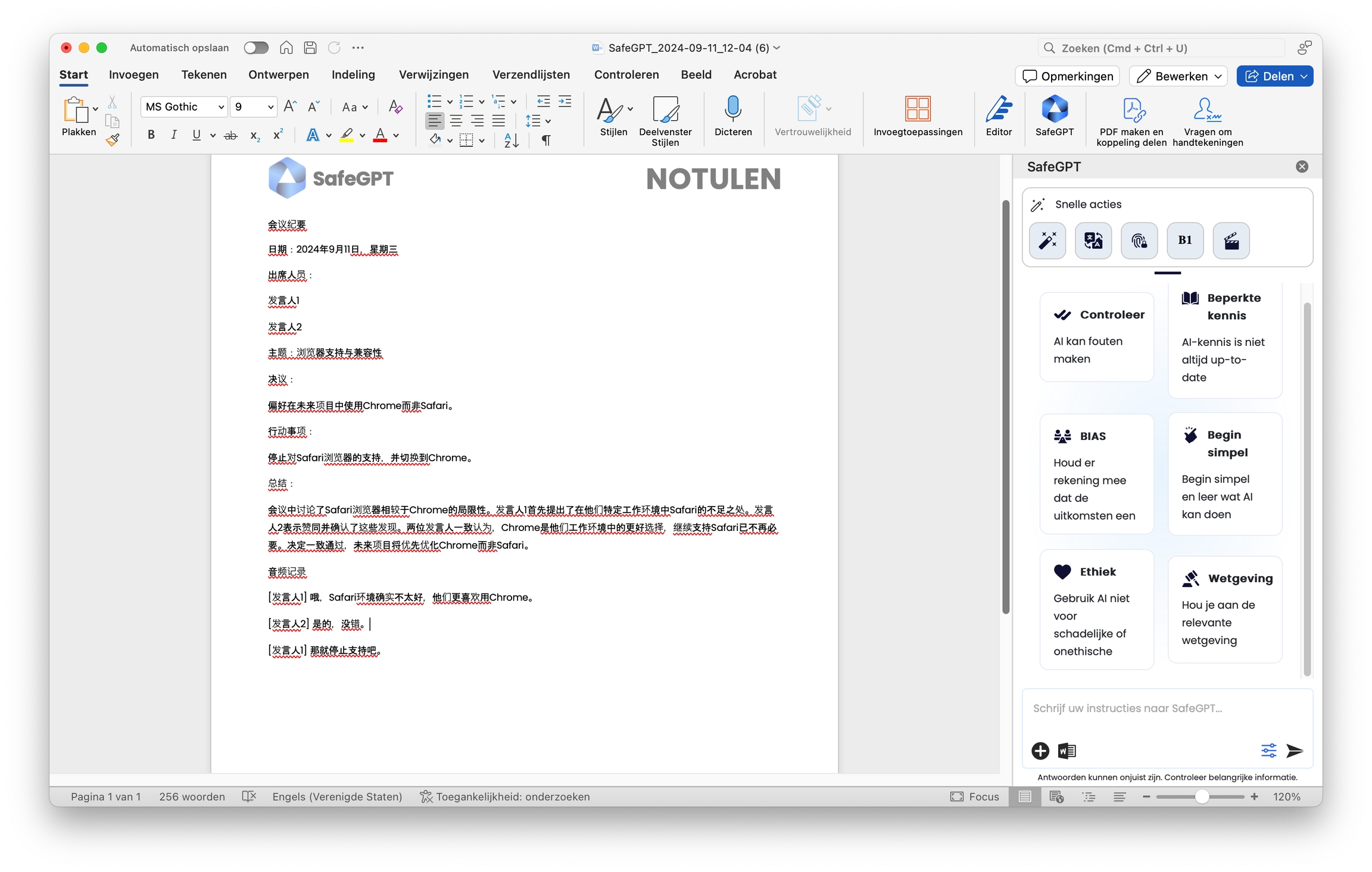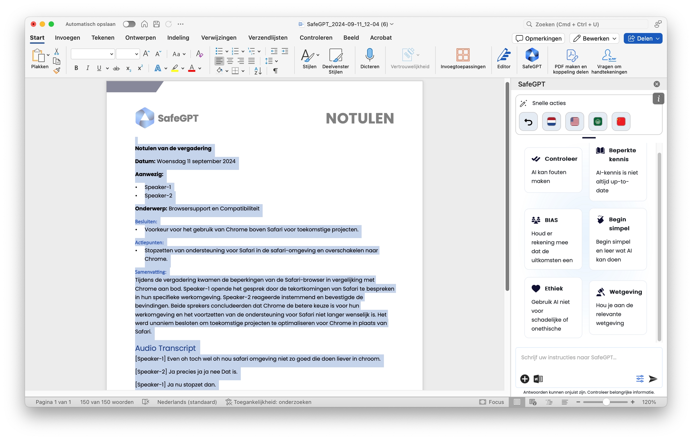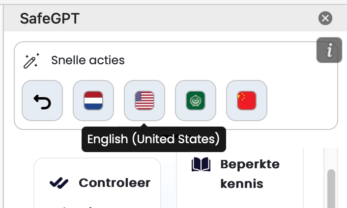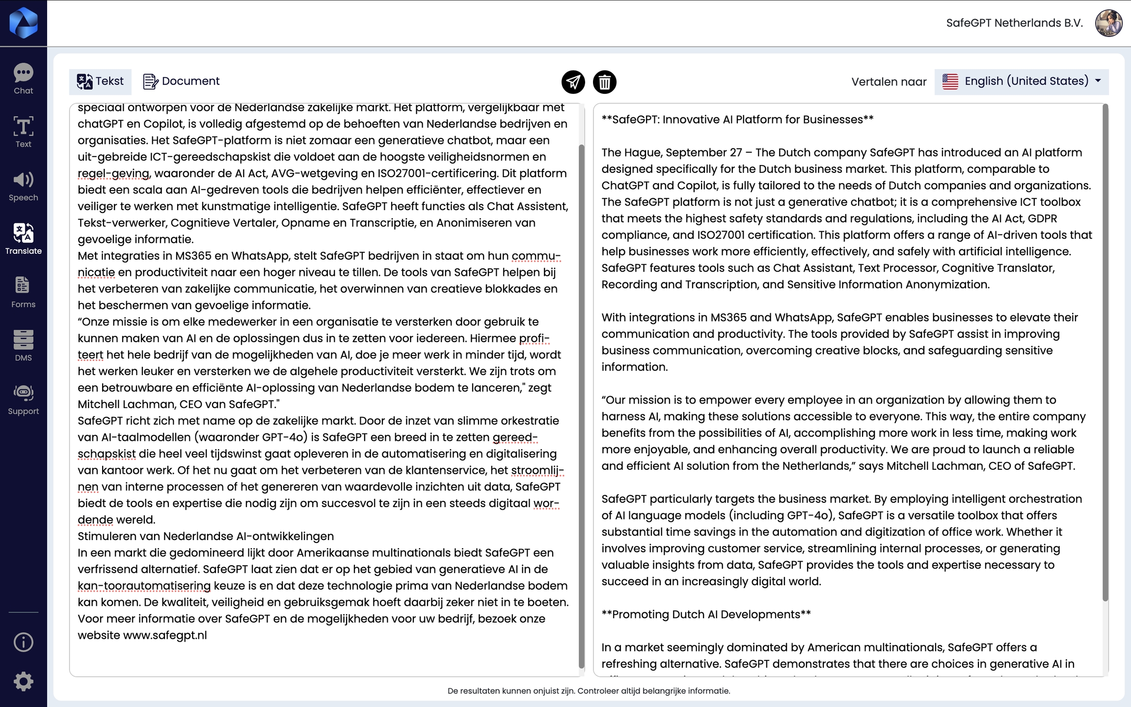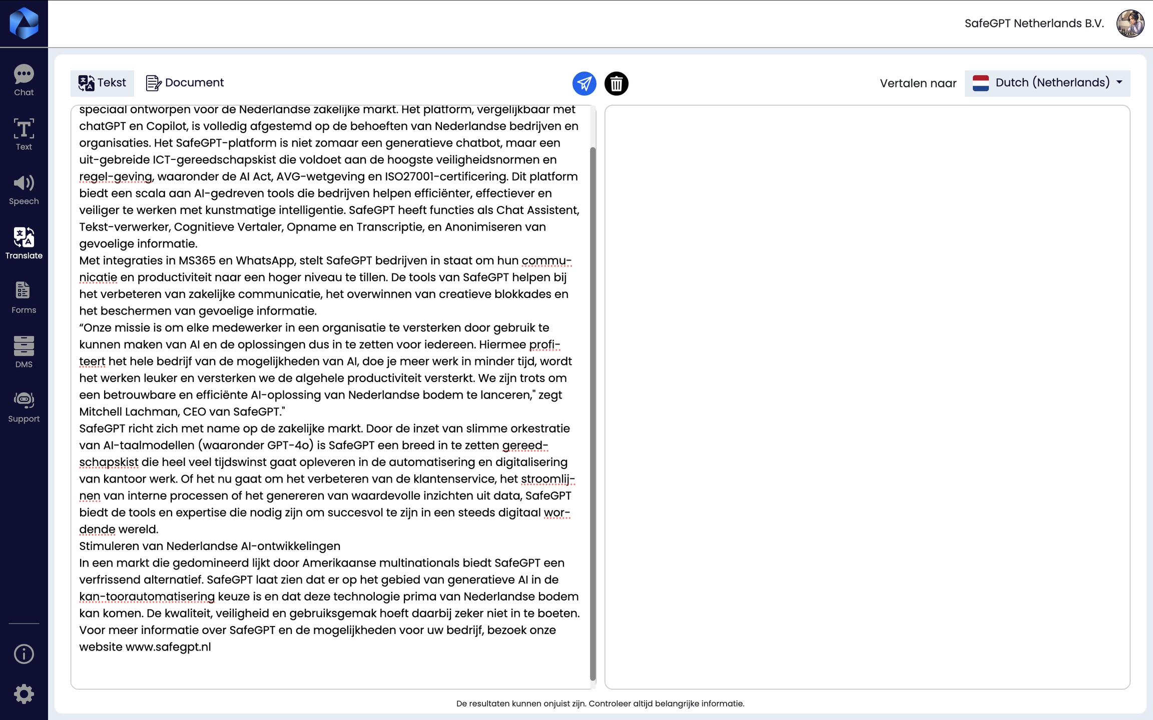 Choose the documents option to translate an entire document. With this feature, the document is translated by SafeGPT and delivered translated in the downloads.