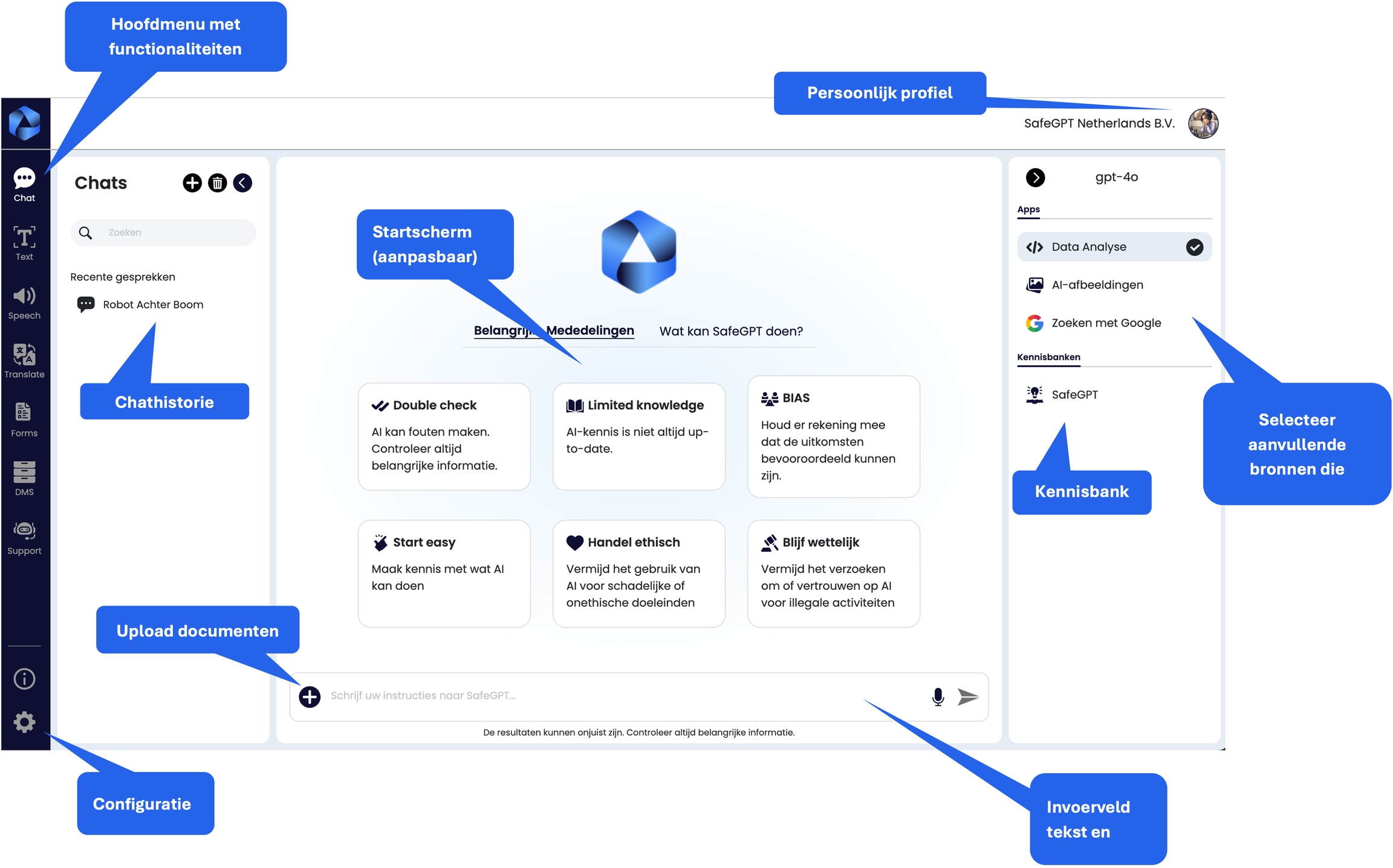 Get started quickly with the web app version of SafeGPT. The web app opens by default in the chat function. Choose the function you want to use from the menu on the left. Chat for conversation with AI, Text for improving texts, Speech for recording meetings and AI-supported minutes. Translate for translating texts.